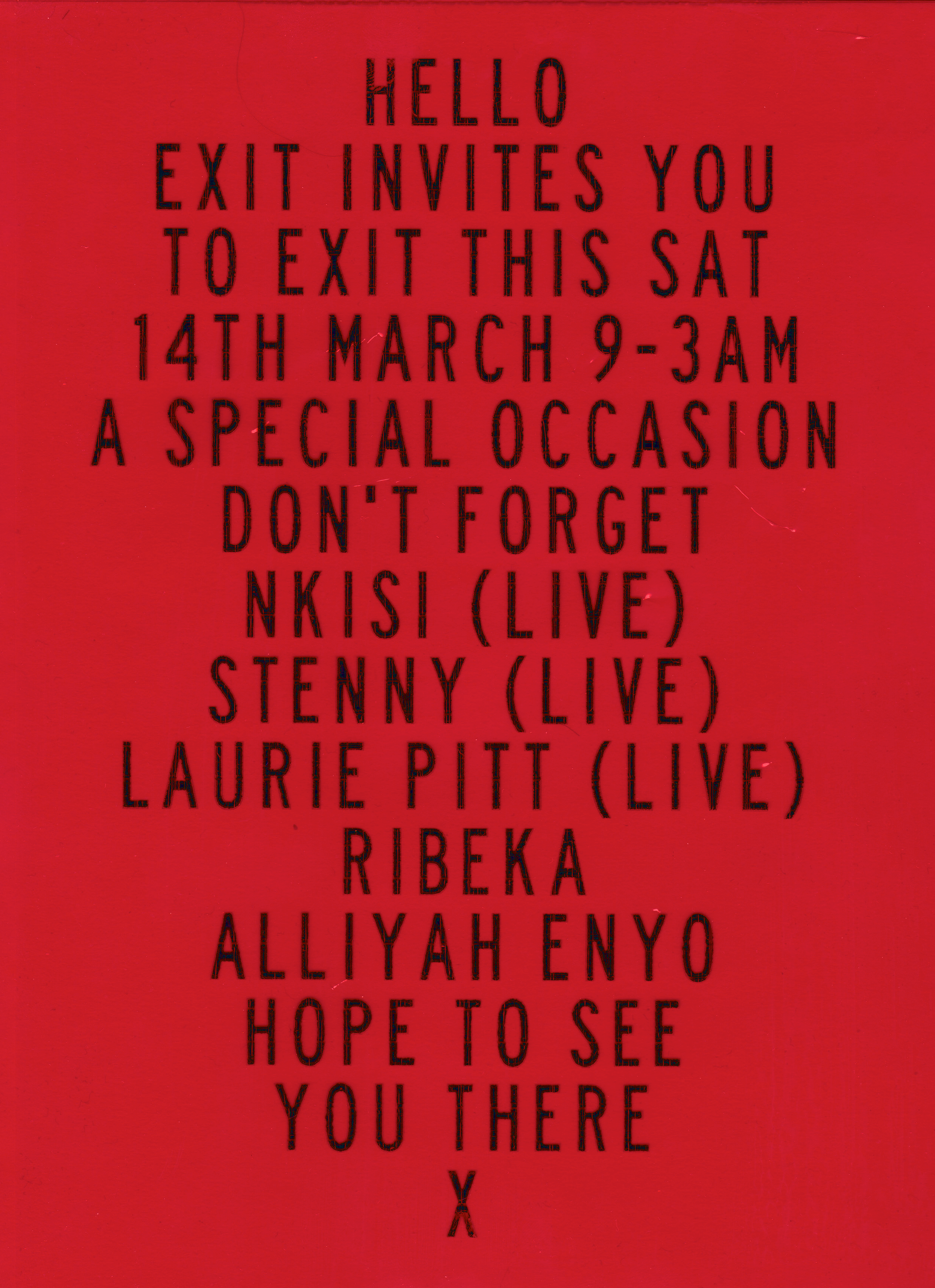 A special EXIT offering in which we aim to challenge the expectations of the club format, disturb modes of consumption, and champion live electronic music performance—platforming contemporary, forward-thinking artists whilst simultaneously nodding to the pillars of the past.