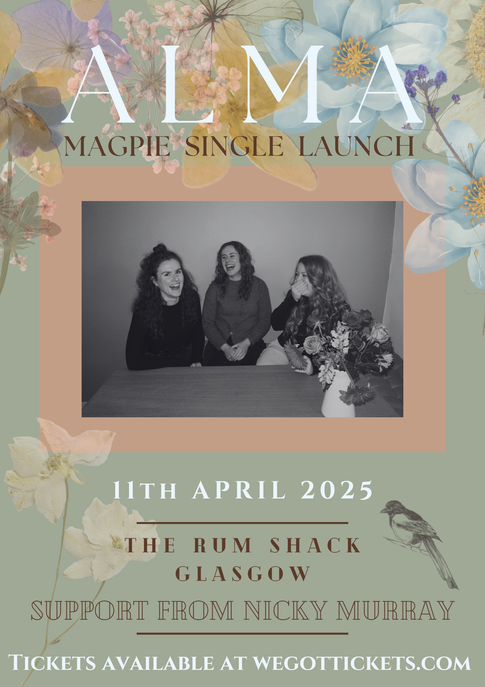 Door time: 7:30pm Start time: 8:00pm £12.50 Join new Glasgow-based trio Alma for the launch of their first single Magpie, featuring full band! The night will be opened by the wonderful local singer songwriter Nicky Murray.
