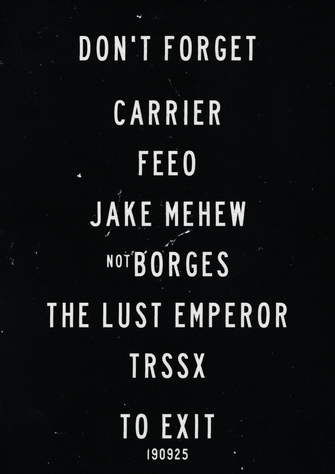 CARRIER, FEEO, JAKE MEHEW. NOT BORGES, THE LUST EMPEROR, TRSSX