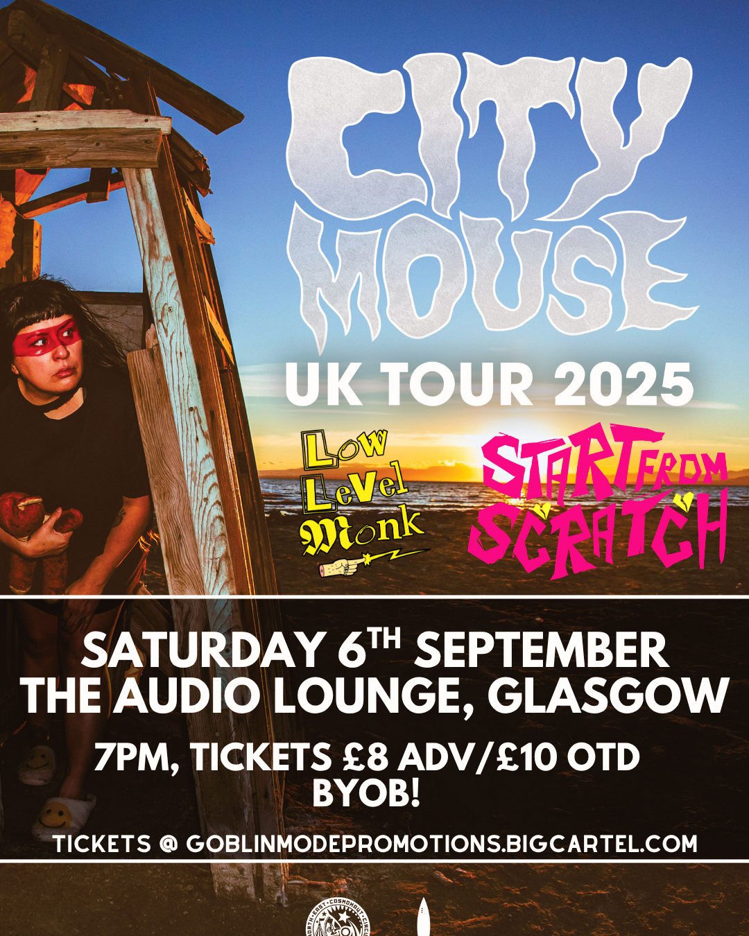 City Mouse UK tour with support from Glasgow pop punk bands Low Level Monk and Start From Scratch BYOB! Tickets £10 otd or £8 at goblinmodepromotions.bigcartel.com