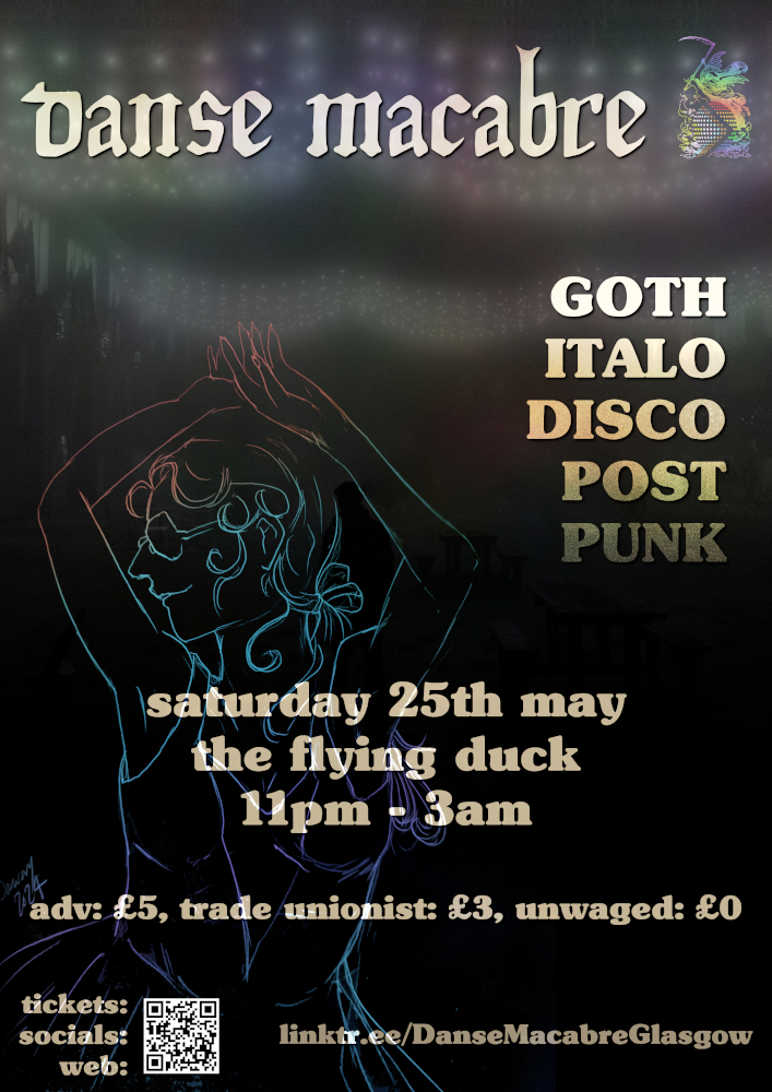 GOTH / ITALO / POST-PUNK / DISCO Queer gothic disco since 2010. Advance tickets: £5 / £3 trade unionist. £7/5 OTD. Free entry for unwaged folk. Venue is accessed by stairs. Gender-neutral toilets available. Bar staff have earplugs. Please take an LFT before attending.