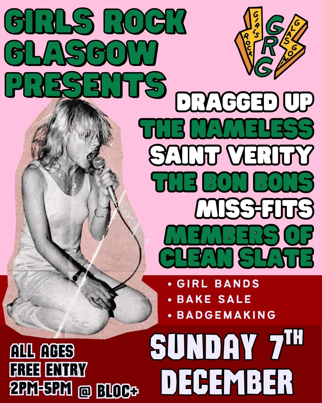 Four of GRG alumni bands take to the stage alongside Saint Verity and Dragged Up. Girls Rock Glasgow provides Rock Music Education for Young Girls and Gender-Expansive Youth. The venue is down one flight of steps from street level. Free entry - All-Ages