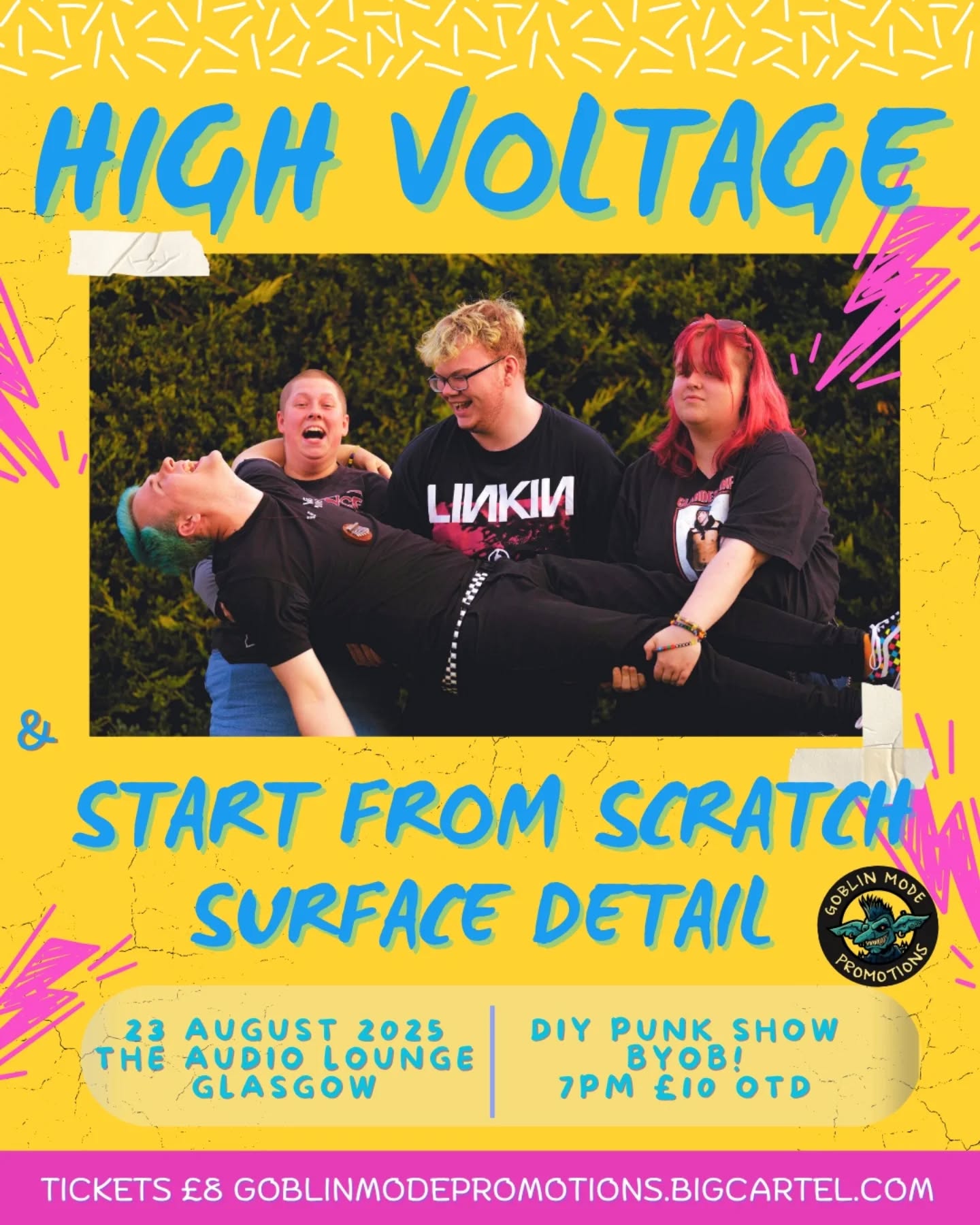 High Voltage EP Launch , BYOB ! Tickets £10 otd or £8 adv from goblinmodepromotions.bigcartel.com Goblin Mode Promotions are a women/non binary team focused on diy punk gigs