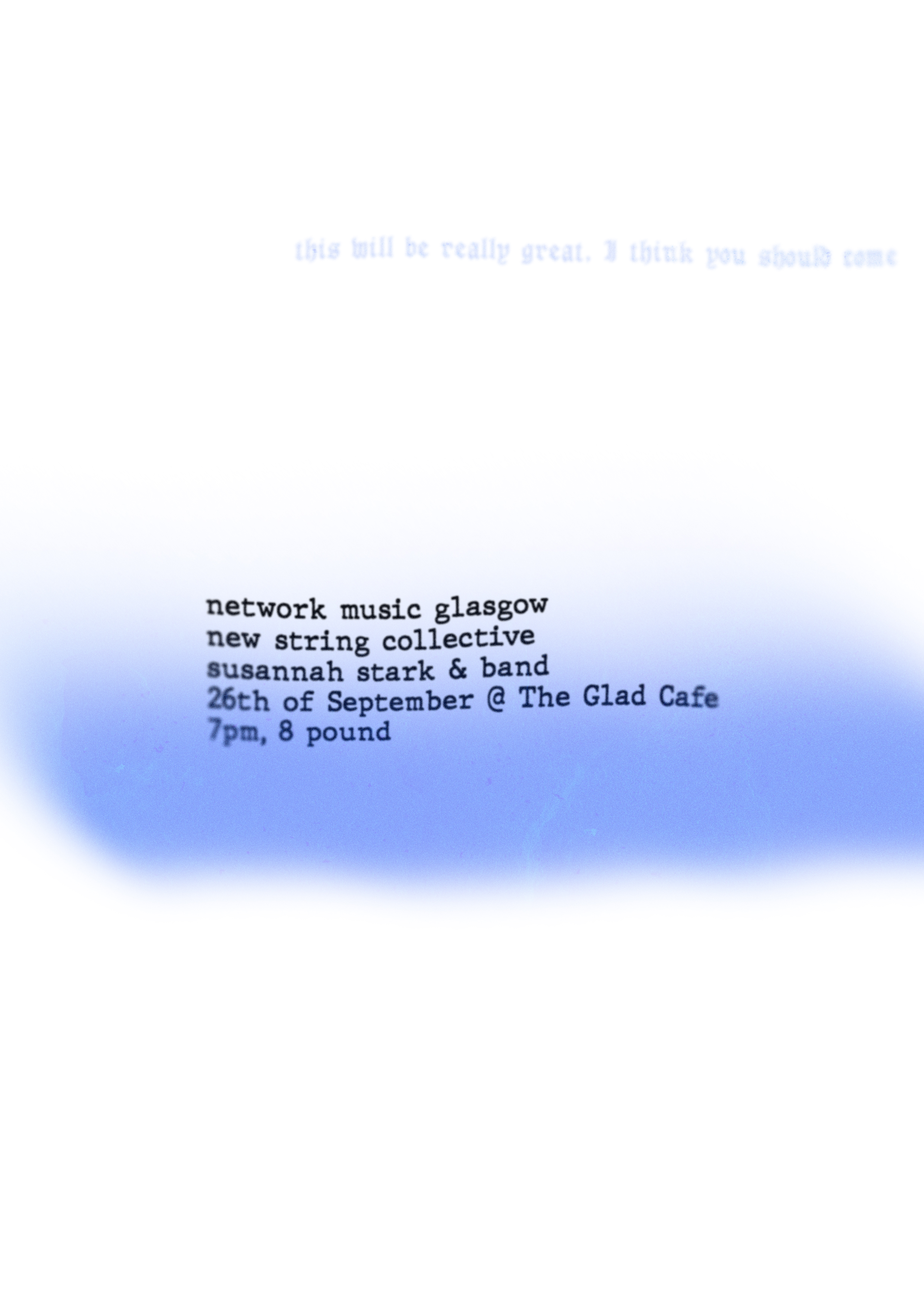 'this will be really great. I think you should come' - newly composed and improvised music from in and around Glasgow featuring Network Music Glasgow (Neil Quigley, Rachel Ni Chuinn + Simon Weins) + New String Collective + Susannah Stark. £8 / pwyc 7pm doors, The Glad Cafe