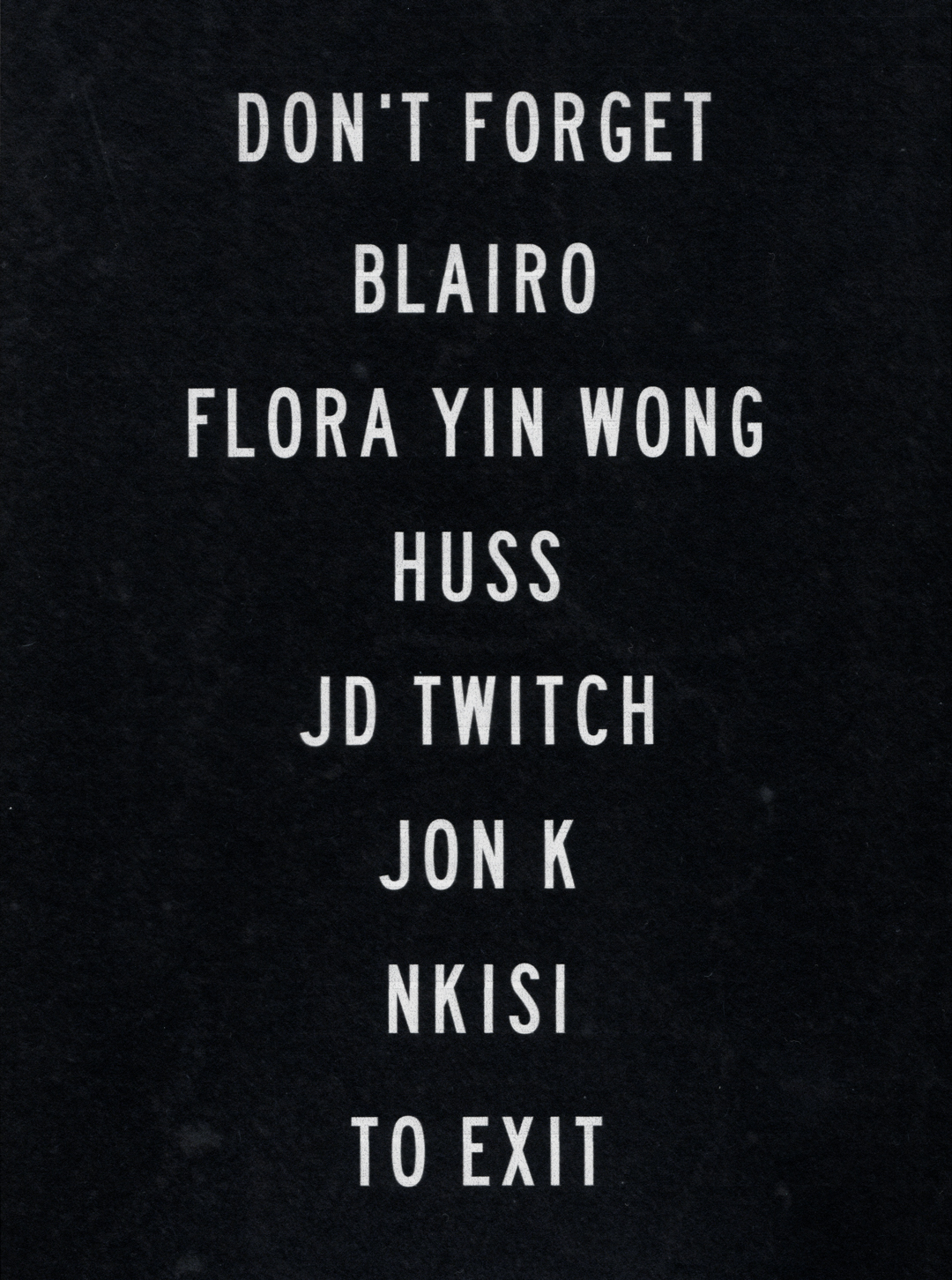 The third edition of EXIT's experimental/live/club series with Nkisi, Flora Yin Wong & Huss performing Live, and DJ sets from blairo, Glasgow legend JD Twitch (Optimo) and underground hero Jon K.
