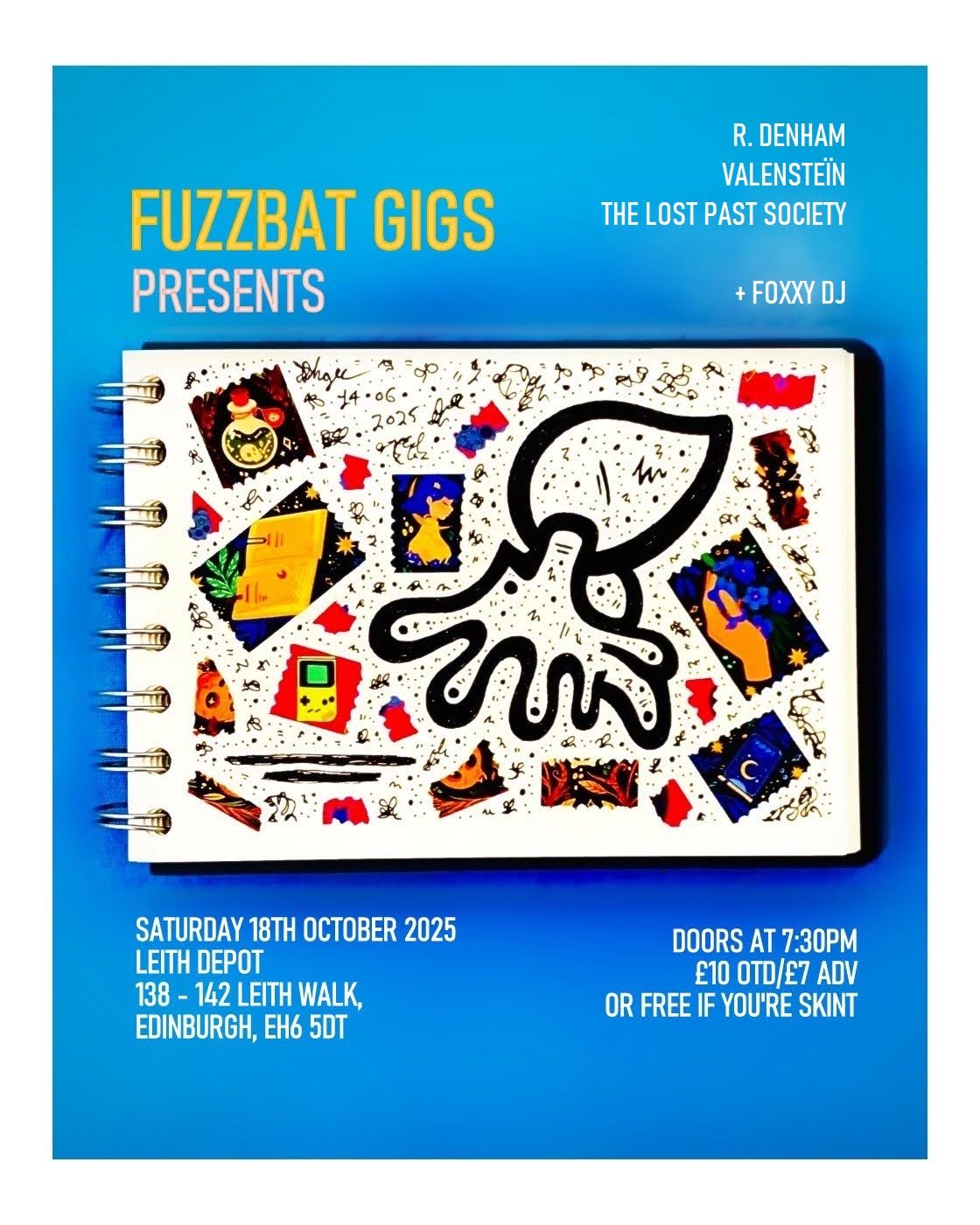 Fuzz Bat returns to Leith Depot with a cracking lineup featuring Industrial/ambient gloomy bastard: R Denham, Emotional electronic alt pop maker: Valensteïn, Drony/ambient soundscape merchant: The Lost Past Society plus a house DJ set from Foxxy DJ. £10 OTD/£7 ADV/Free if Skint