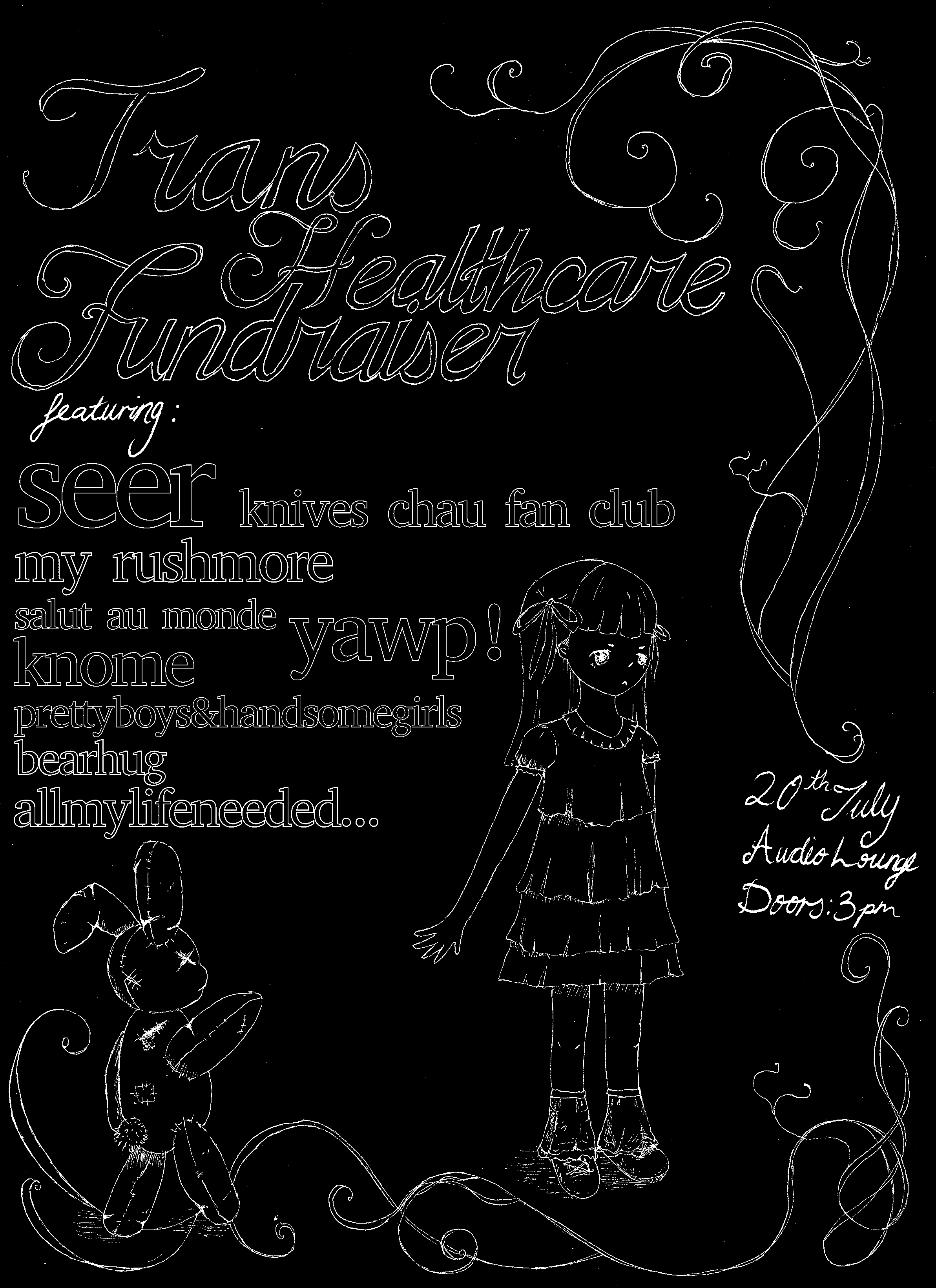 all dayer to raise money for trans healthcare! the money will be split between members of the community as well as @fiveforfiveuk and @transhealthaccessglasgow. tickets are sliding scale £0-25, pay what you can (i cant add a £0 option on big cartel so contact if you want to come)