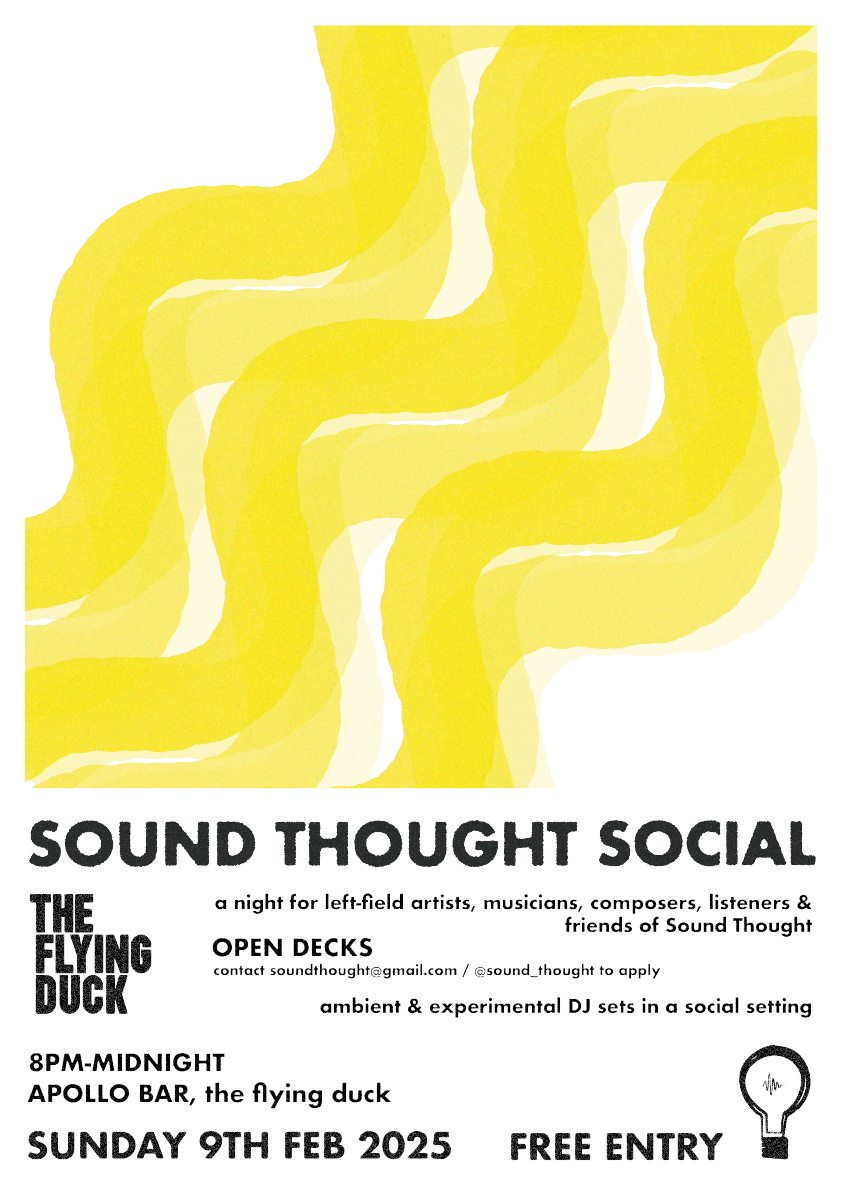 OPEN DECKS at the next Sound Thought Social! Spaces will be pre-arranged. To apply, send a summary of your intended performance (max. 100 words) to [email protected]. Deadline for applications is 26/01/25, 23:59. More info at link below.
