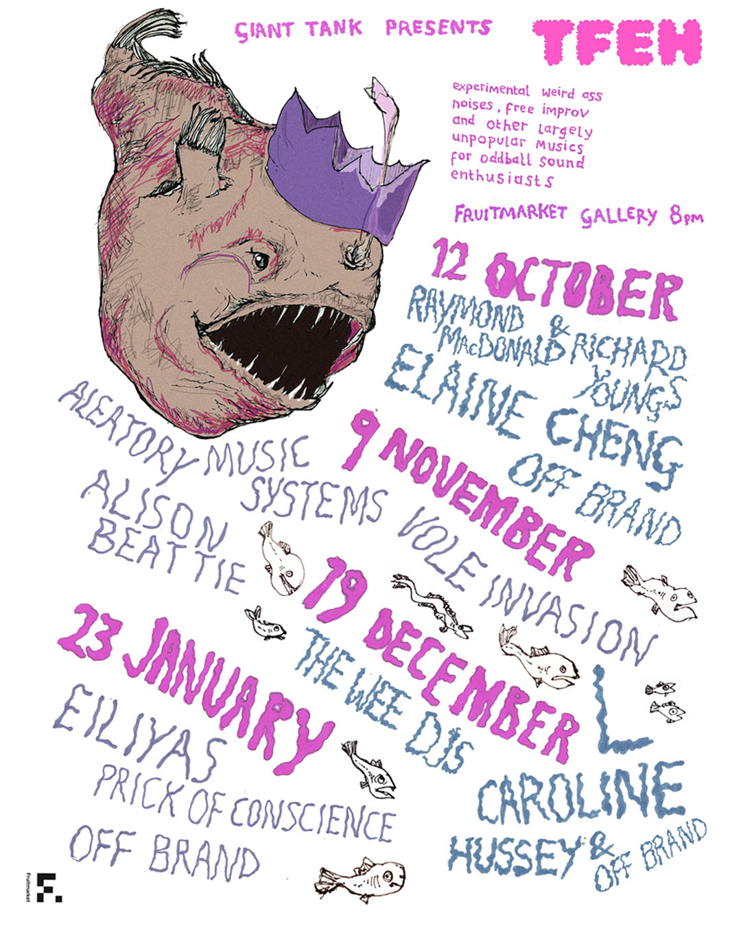 TFEH screams in the face of the January melancholy with a triple bill of experimental music & oddball sound, primed to scare yr Seasonal Affective Disorder away. Doors= 8pm. Cost= £10 / NOTALOF. Fruitmarket, 45 Market St., Edinburgh, EH1 1DF. Fruitmarket is fully accessible.